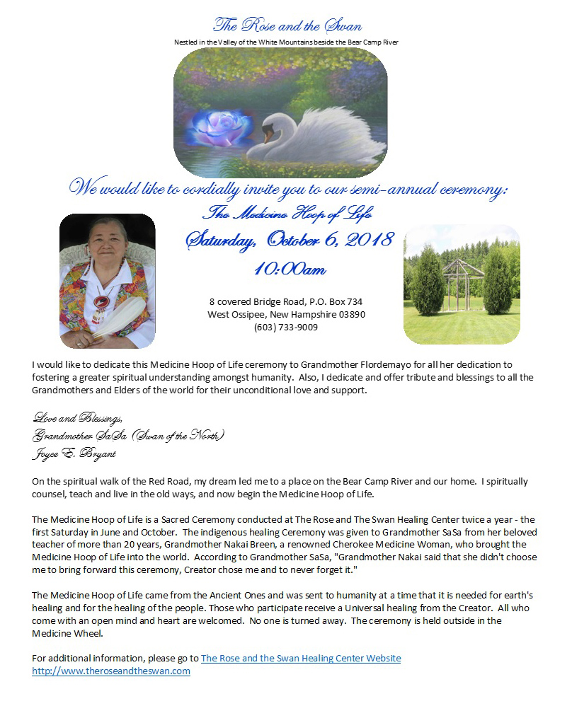 The Medicine Hoop of life came from the Ancient Ones and was sent to humanity at a time that it is needed for earth’s healing and for the healing of the people. Those who participate receive a Universal healing from the Creator. All who come with an open mind and heart are welcome. No one is turned away. The ceremony is held outside in the Medicine Wheel.